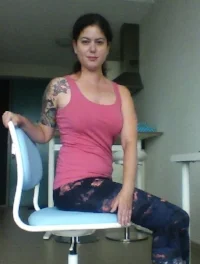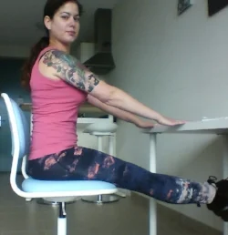 Arms stretch: Stretch your arms! All over the place! Seriously, stretch them forward, backward and to the sides. I am doing this even when in the street and waiting at the bus stop. Stretch them backward (holding the chair) so you can feel your chest open.